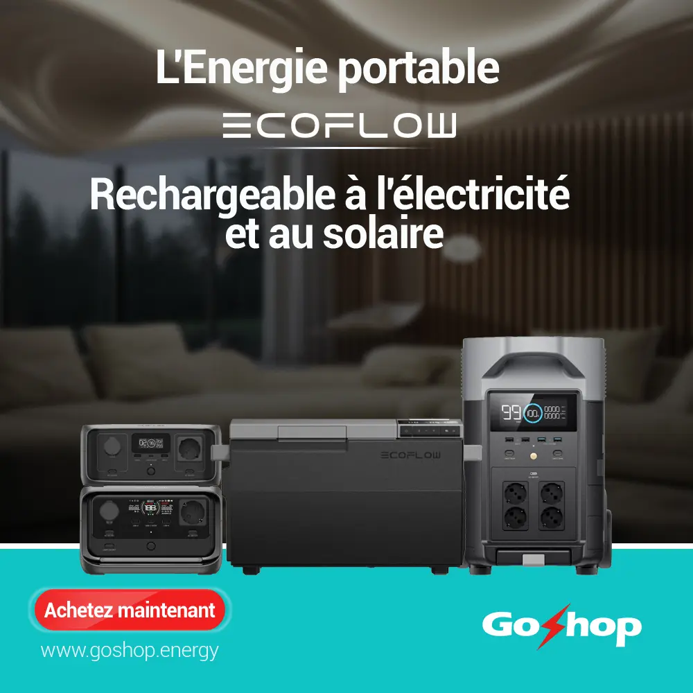 GoShop Energy has the answer. A complete range of EcoFlow solar kits is available at our Kinshasa branch, designed to support you and improve your daily life with immediate, portable, and 100% solar energy.