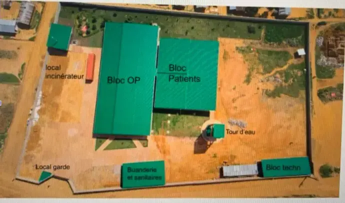 De plus, l'hôpital couvre une superficie approximative d'un hectare et a été construit en plusieurs sections, chacune remplissant des fonctions spécifiques. Ces segments incluent : le bloc OP (opératoire), le bloc des Patients (chambres d'hospitalisation), le segment buanderie et sanitaires, le segment technique, la tour d'eau, la zone de l'incinérateur, ainsi que des segments projetés pour le futur, comme celui de la maternité