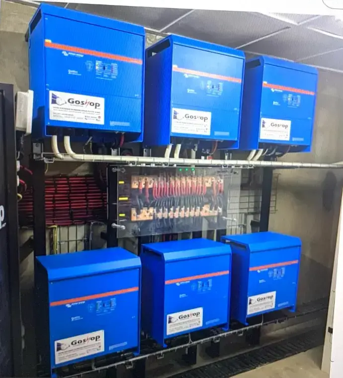 À l'Hôpital Unichir Beni, la stratégie de sauvegarde est constituée de six convertisseurs Victron Quattro d'une puissance de 15 kVA chacun. Ces appareils fonctionnent sur un système à courant continu (DC) de 48 volts et génèrent un courant alternatif (AC) de 230 volts en sortie.